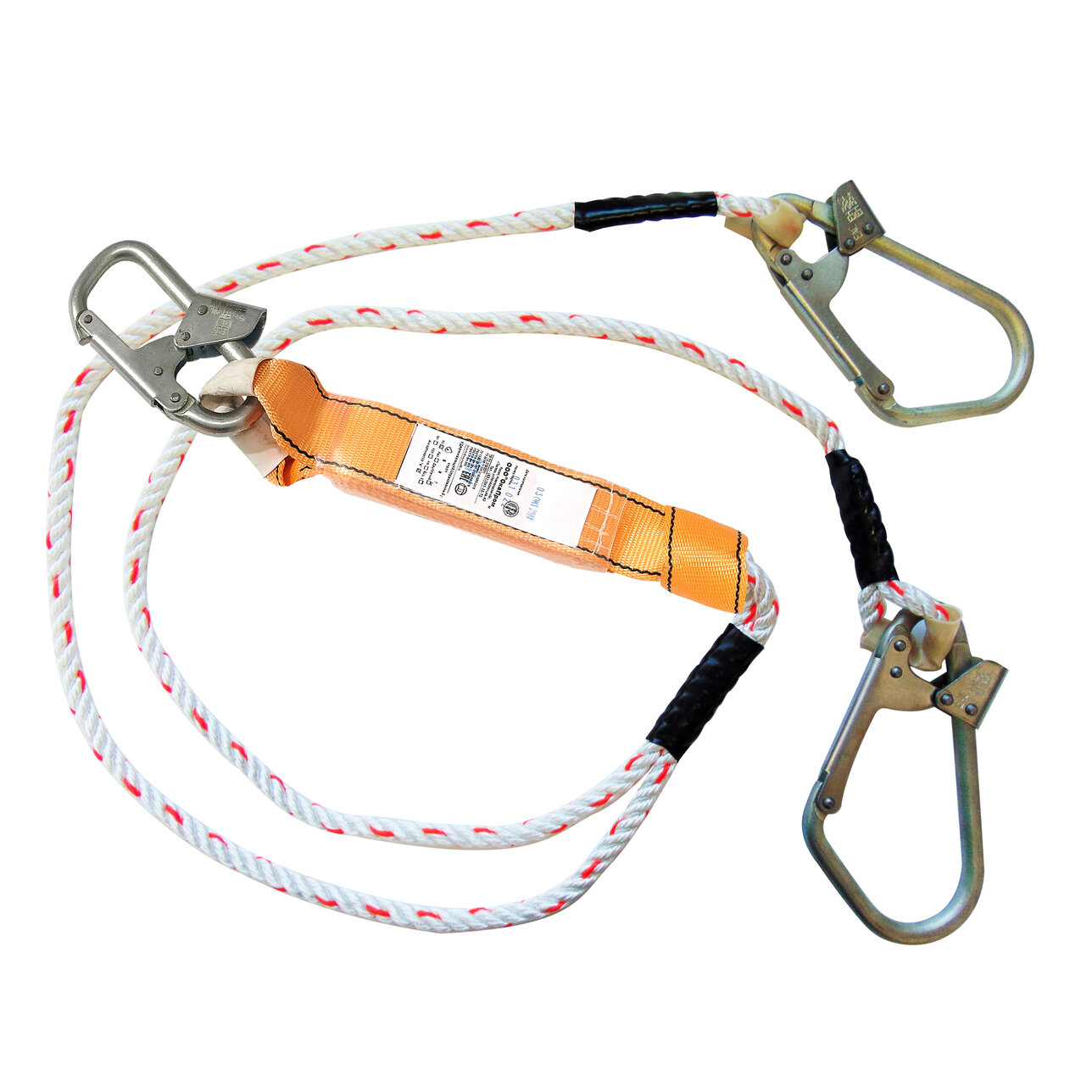 Строп аВд + К25 (канат, вар. 2) - строп для удержания и страховки при выполнении высотных работ. Представляет собой двуплечий фал из 3-х прядного полиамидного каната с амортизатором рывка, 2-мя большими монтажными карабинами класса А и малым монтажным карабином класса Т.