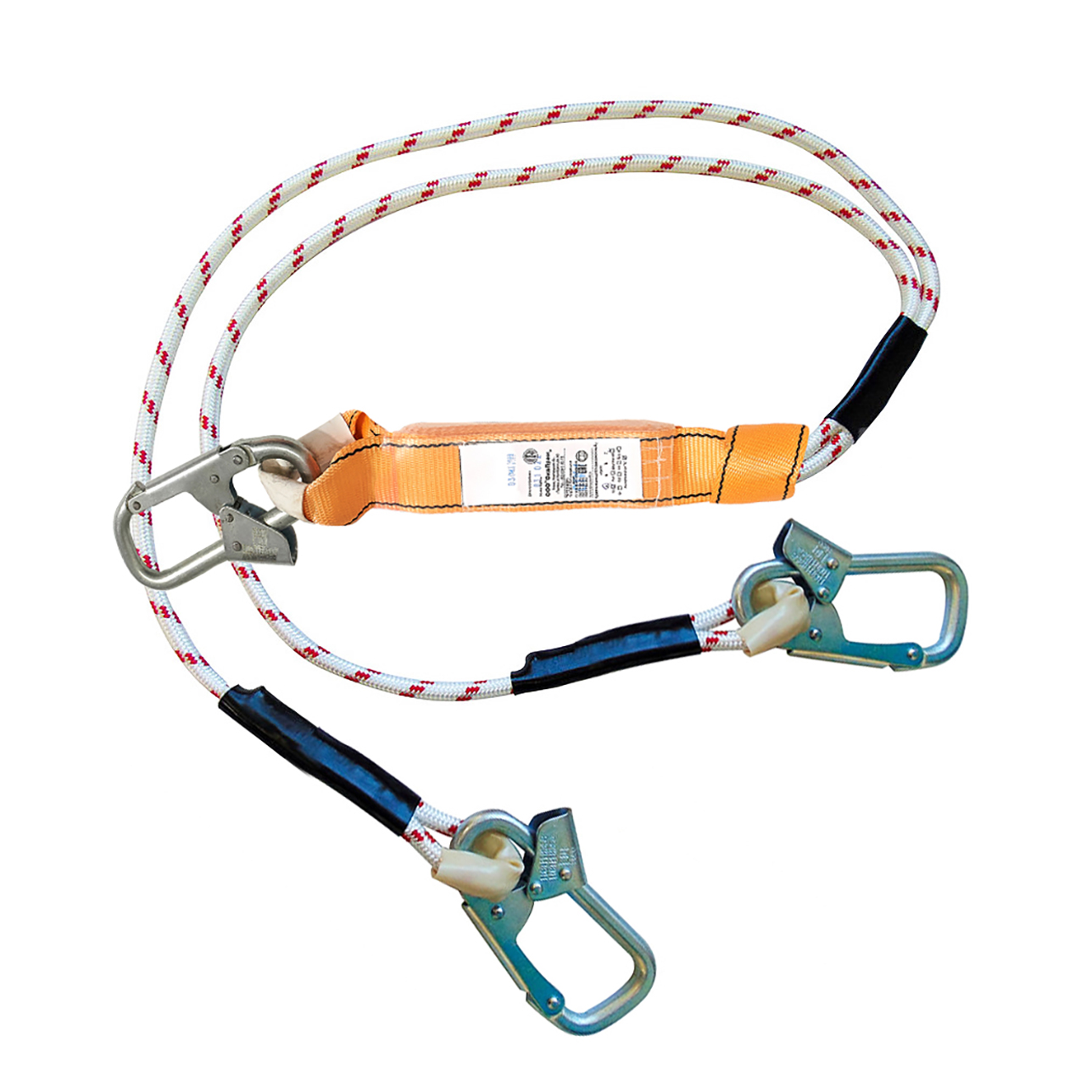 Строп аВд + К25 (верёвка) - строп для удержания и страховки при выполнении высотных работ. Представляет собой двуплечий фал из 24-х прядной полиамидной верёвки с амортизатором рывка и 3-мя малыми монтажными карабинами класса Т.