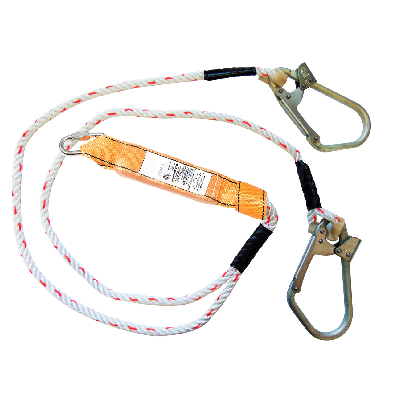 Строп аВд + Кс (канат, вар. 2) - строп для удержания и страховки при выполнении высотных работ. Представляет собой двуплечий фал из 3-х прядного полиамидного каната с амортизатором рывка, 2-мя большими монтажными карабинами класса А и соединительным винтовым карабином класса Q.