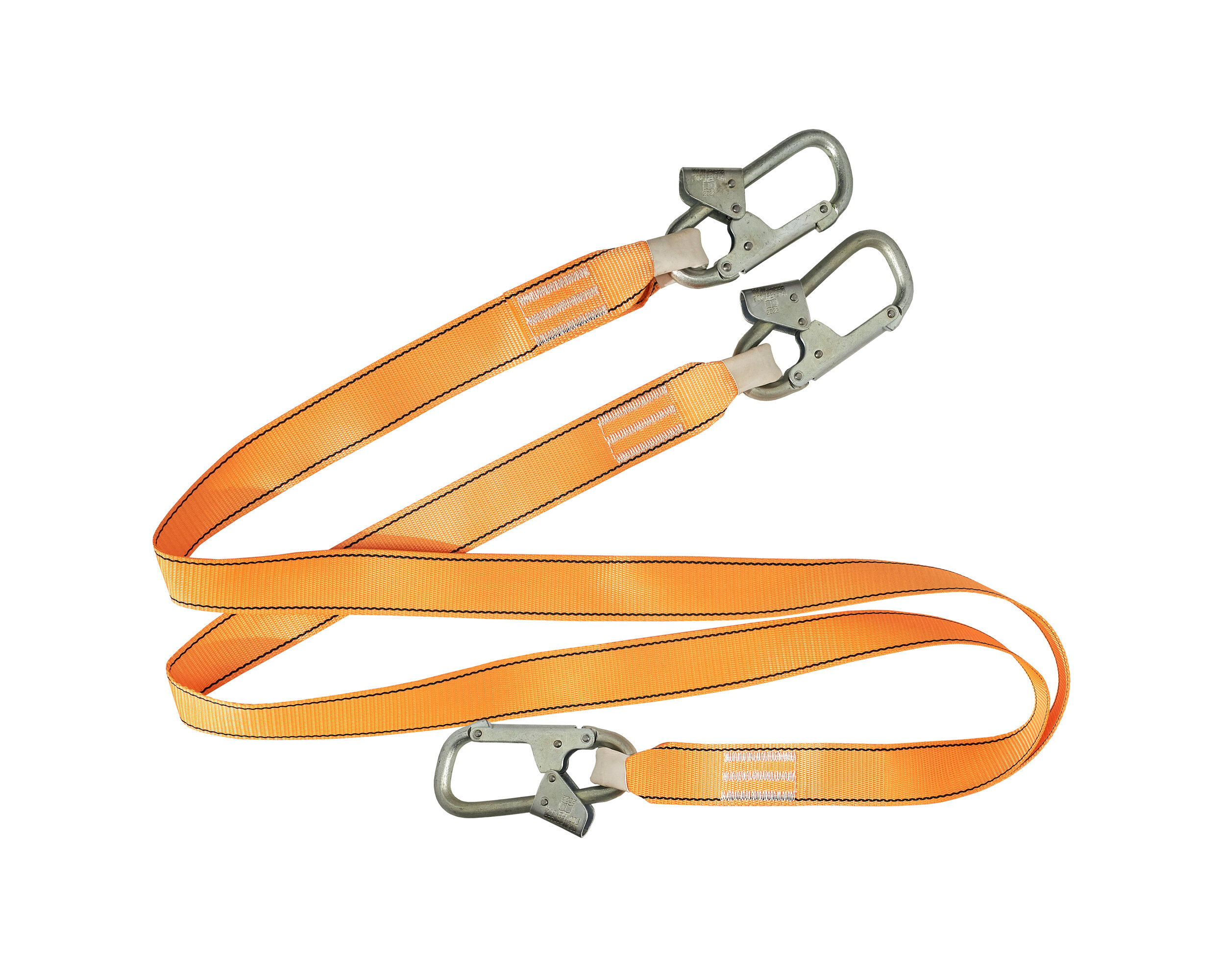 Строп Ад + К25 (лента) - двойной строп для позиционирования и удержания. Представляет собой двуплечий фал из полиэфирной ленты с 3-мя малыми монтажными карабинами класса Т.