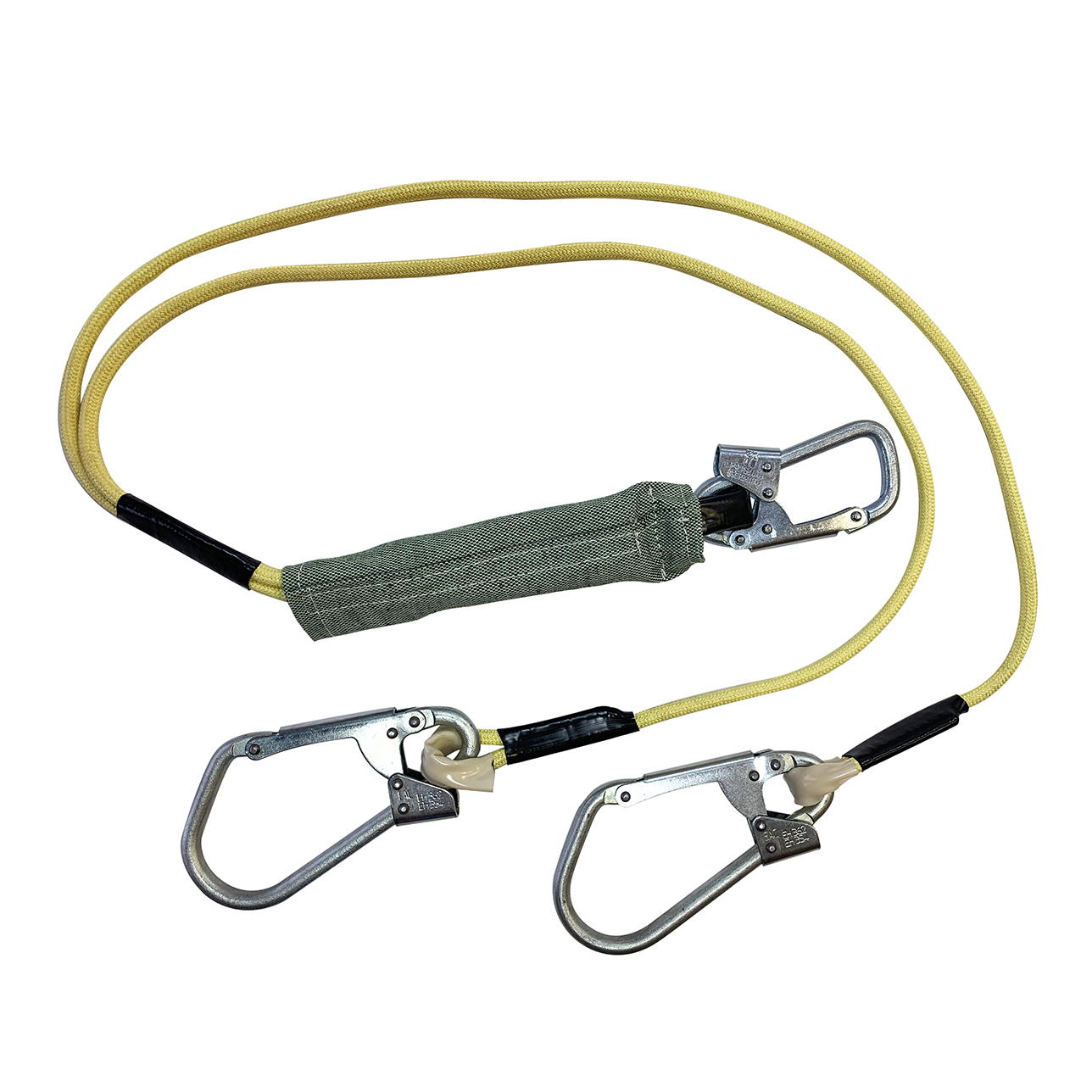 Строп аВд + К25 (Ог, вар. 2) - двойной огнеупорный строп для страховки при выполнении высотных работ. Представляет собой двуплечий фал из 24-х прядной арамидной верёвки с амортизатором рывка в огнестойком чехле, 2-мя большими монтажными карабинами класса А и малым монтажным карабином класса Т.