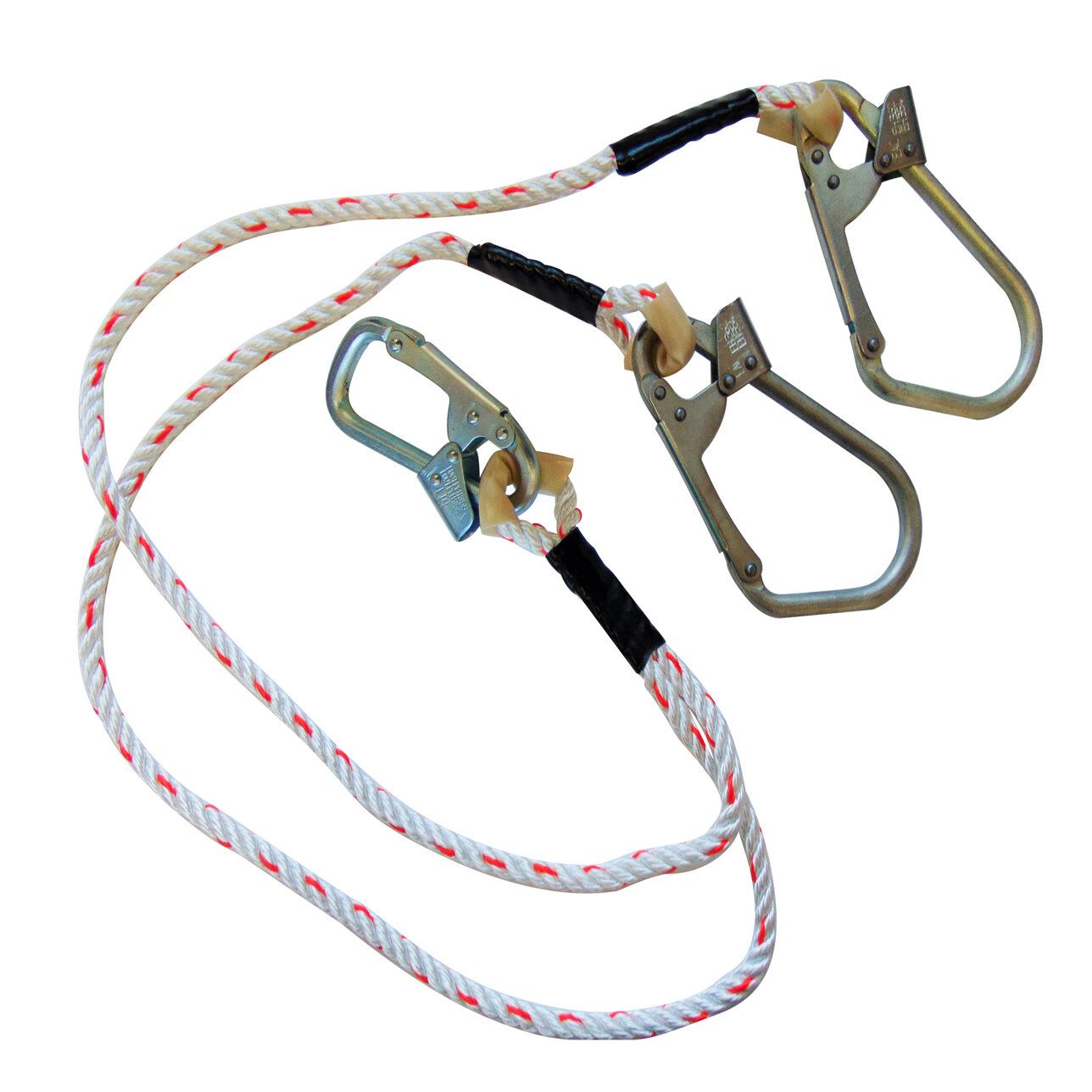 Строп Вд + К25 (канат, вар. 2) - двойной строп для позиционирования и удержания. Представляет собой двуплечий фал из 3-х прядного полиамидного каната с 2-мя большими монтажными карабинами класса А и малым монтажным карабином класса Т.