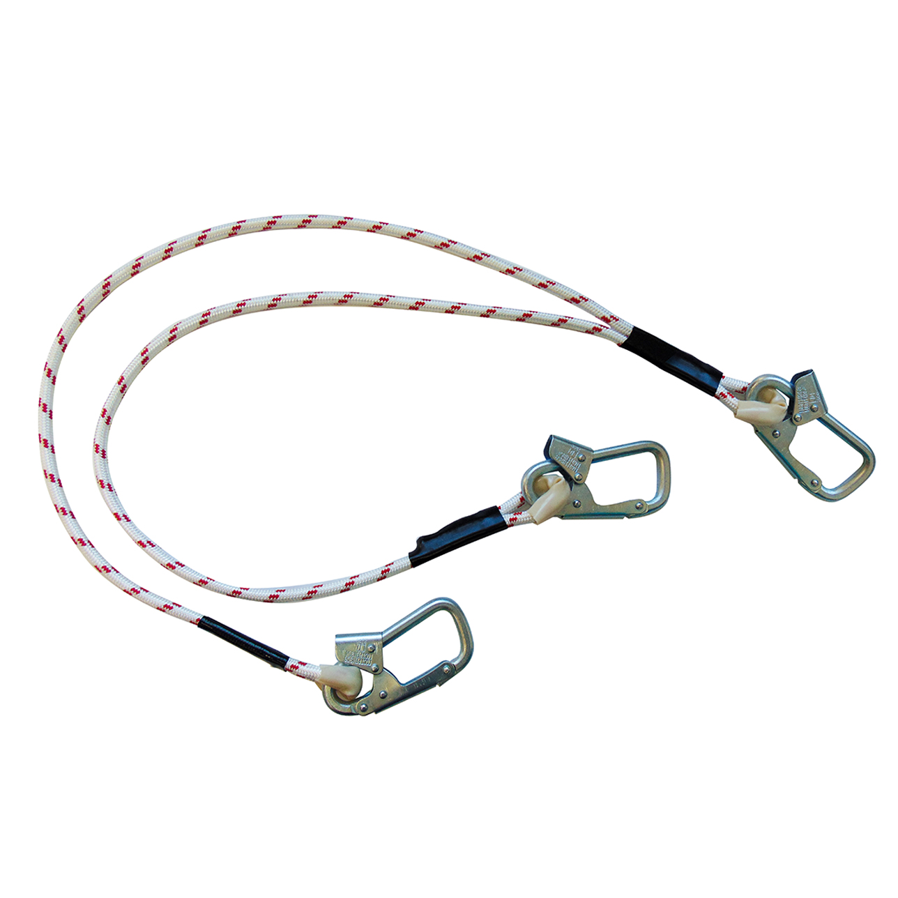 Строп Вд + К25 (верёвка) - двойной строп для позиционирования и удержания. Представляет собой двуплечий фал из 24-х прядной полиамидной верёвки с 3-мя малыми монтажными карабинами класса Т.