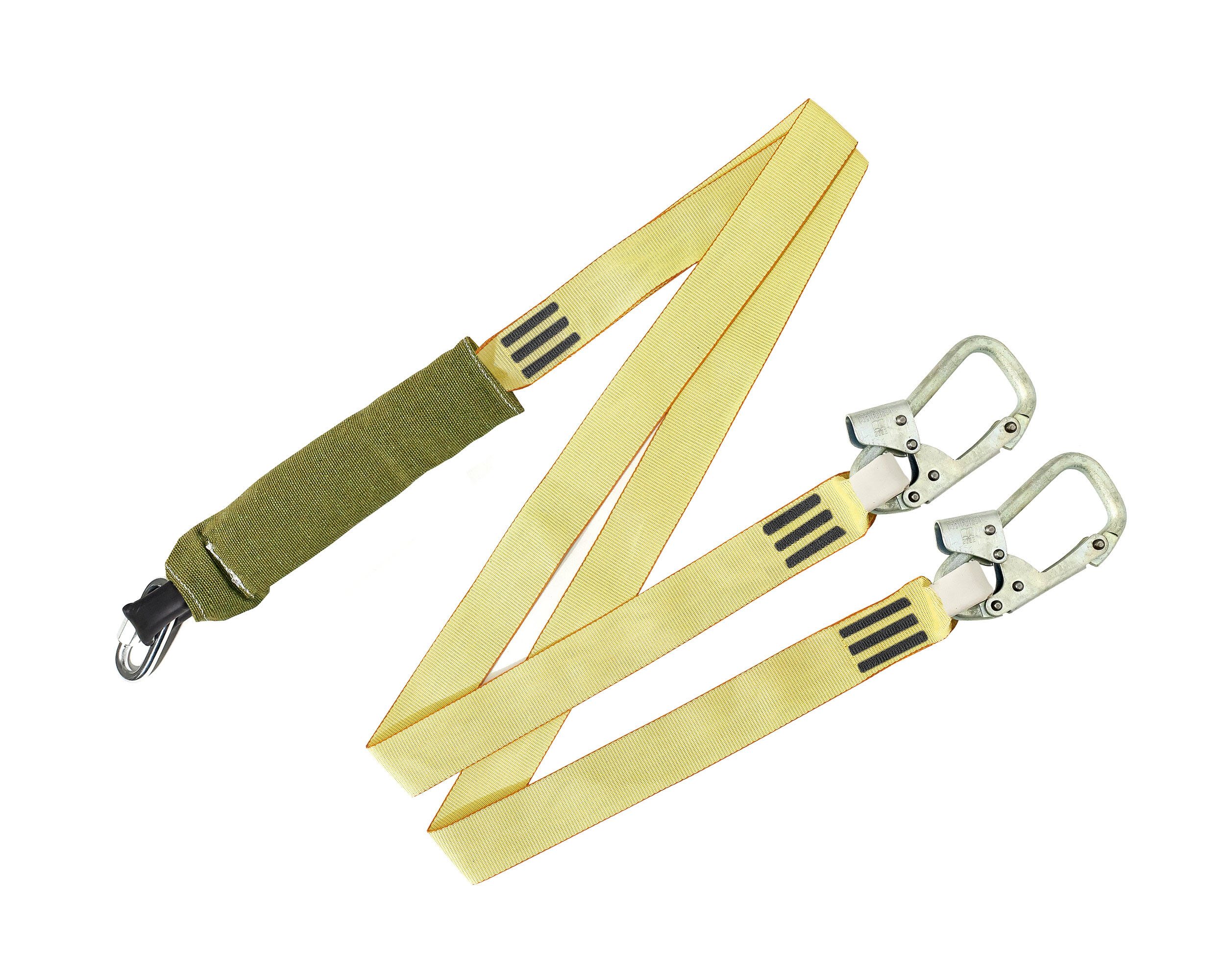 Строп аАд + Кс (Ог) - огнеупорный строп для удержания и страховки при выполнении высотных работ. Представляет собой двуплечий фал из арамидной ленты с амортизатором рывка в огнестойком чехле с 2-мя малыми монтажными карабинами класса Т и соединительным винтовым карабином класса Q.