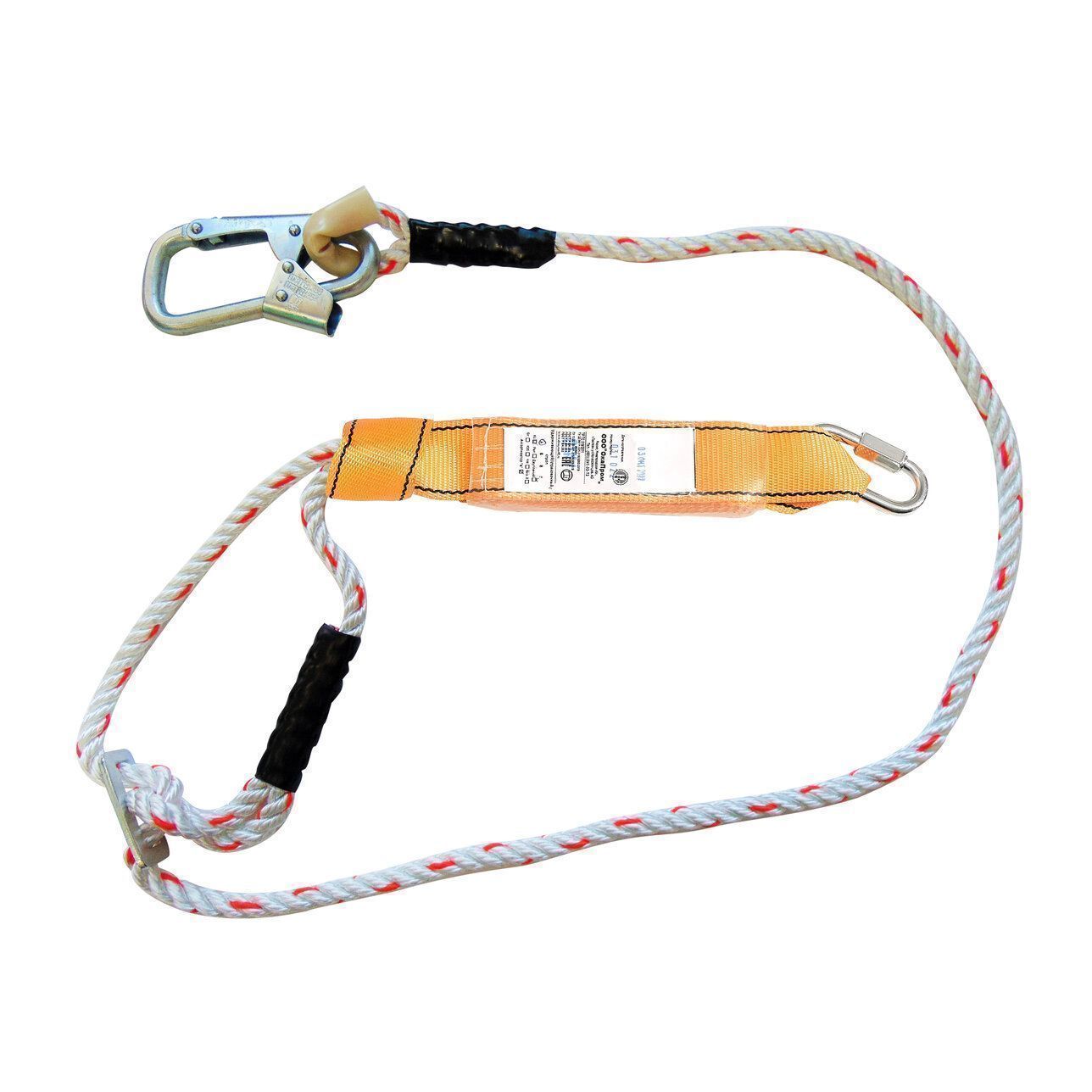 Строп аВрег + Кс (канат) - регулируемый строп для удержания и страховки при выполнении высотных работ. Представляет собой фал из 3-х прядного полиамидного каната с амортизатором рывка, малым монтажным карабином класса Т и соединительным винтовым карабином класса Q.
