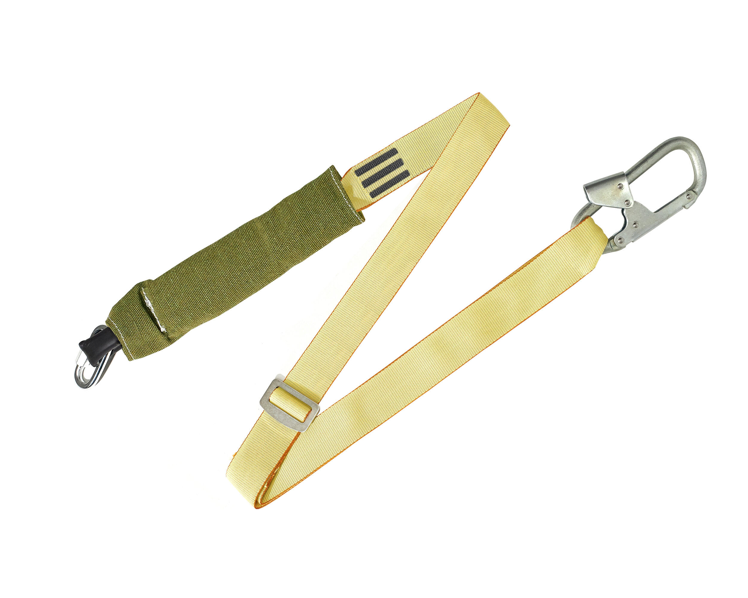 Строп аАрег + Кс (Ог) - регулируемый огнеупорный строп для удержания и страховки при выполнении высотных работ. Представляет собой фал из арамидной ленты с амортизатором рывка в огнестойком чехле с малым монтажным карабином класса Т и соединительным винтовым карабином класса Q.