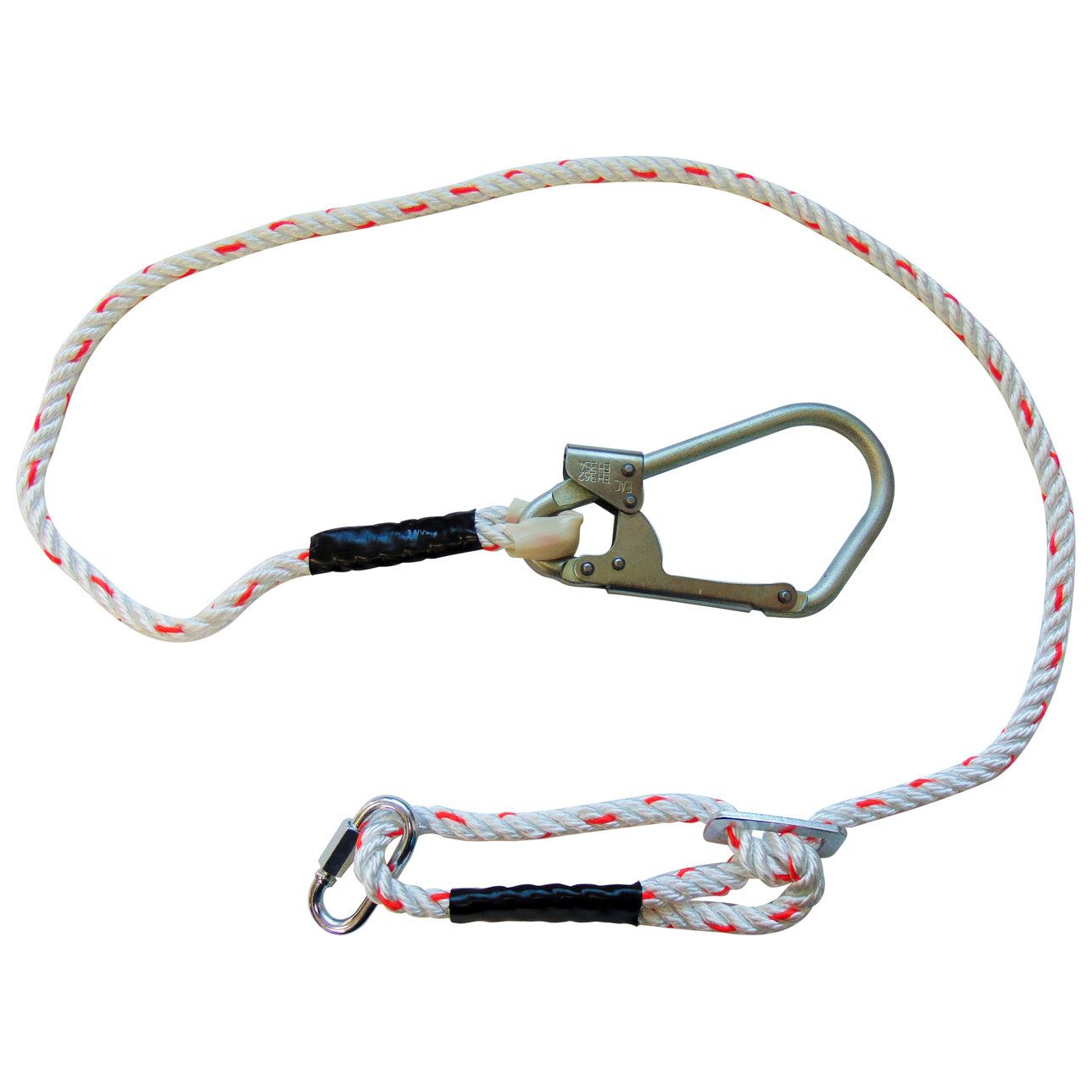 Строп Врег + Кс (канат, вар. 2) - регулируемый строп для позиционирования и удержания. Представляет собой фал из 3-х прядного полимидного каната с большим монтажным карабином класса А и соединительным винтовым карабином класса Q.