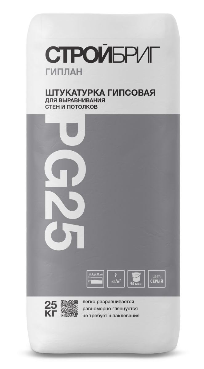 Гипсовая штукатурка серая СТРОЙБРИГ ГИПЛАН PG25 предназначена для выравнивания стен и потолков в помещениях с нормальной влажностью. Для внутренних работ. Штукатурка Гиплан обладает следующими свойствами: