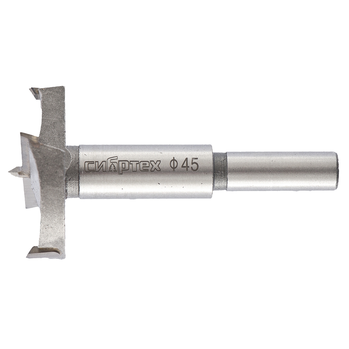 Сверло Форстнера по дереву, 45 мм, цилиндрический хвостовик // СИБРТЕХ изготовлено из углеродистой стали и оснащено твердосплавными пластинами для увеличения стойкости и производительности.