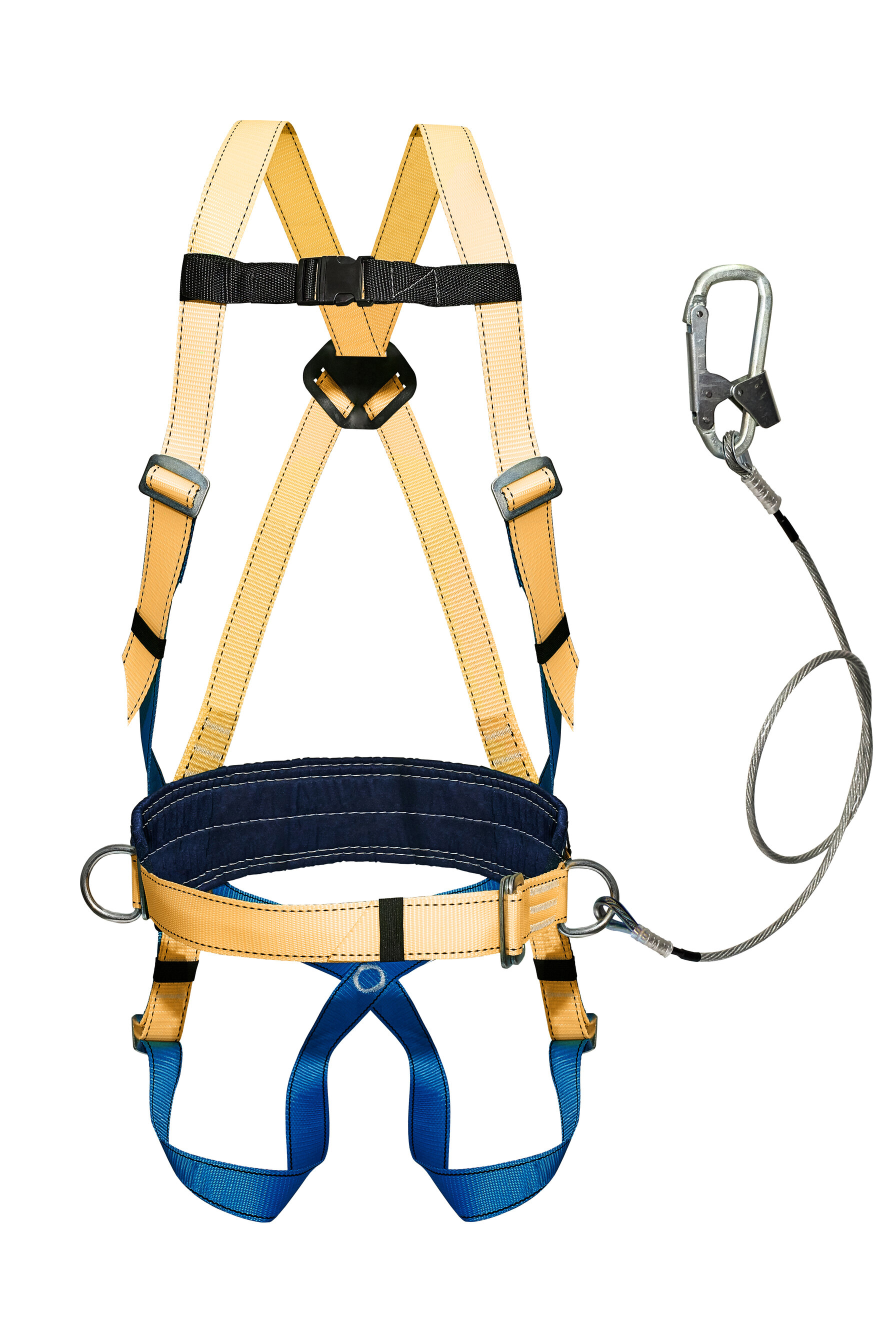 Удерживающая система оснащена стропом из металлического троса в ПВХ оболочке (строп Б) с монтажным карабином.