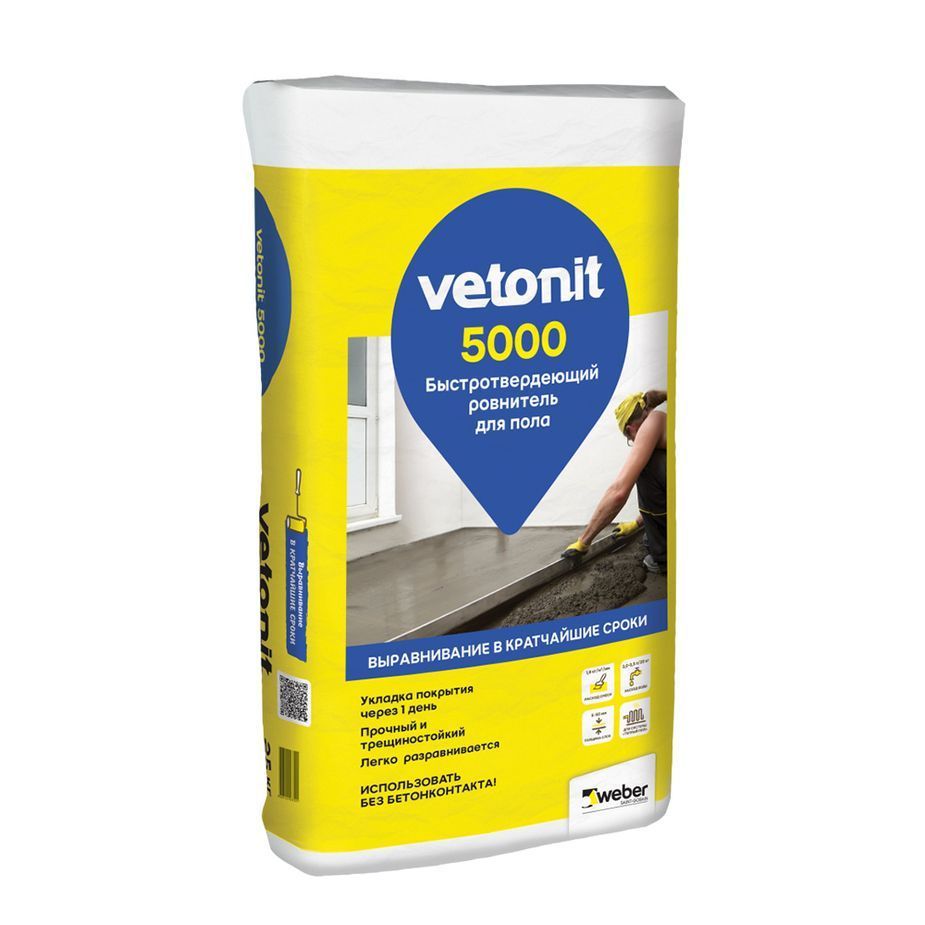 ВЕБЕР.ВЕТОНИТ 5000 / Weber.vetonit 5000 - быстротвердеющий ровнитель с разрешенным слоем нанесения 5-50 мм и возможностью локального ремонта до 80 мм. Продукт обладает высокой пластичностью и позволяет создать стяжку в кратчайшие сроки, до 5 дней в зависимости от толщины слоя. Прочность на сжатие - 20 МПа. По полу можно ходить уже через 3-4 часа. Применяется как для сухих, так и для влажных помещений.