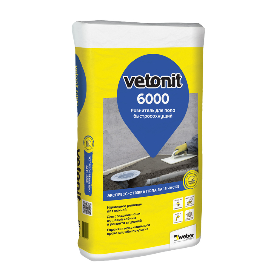 ВЕБЕР.ВЕТОНИТ 6000 / Weber.vetonit 6000 - быстросохнущий ровнитель для пола на цементной основе. Ходить по полу можно уже через 3 часа, а укладка покрытия возможна всего через 15 часов. Оптимальное решение для срочного ремонта и реализации специальных решений: создания подиумов под ванну, формирования чаши душевой кабины, ремонта ступеней, скрытия коммуникаций в полу, заделки труб и проводов.