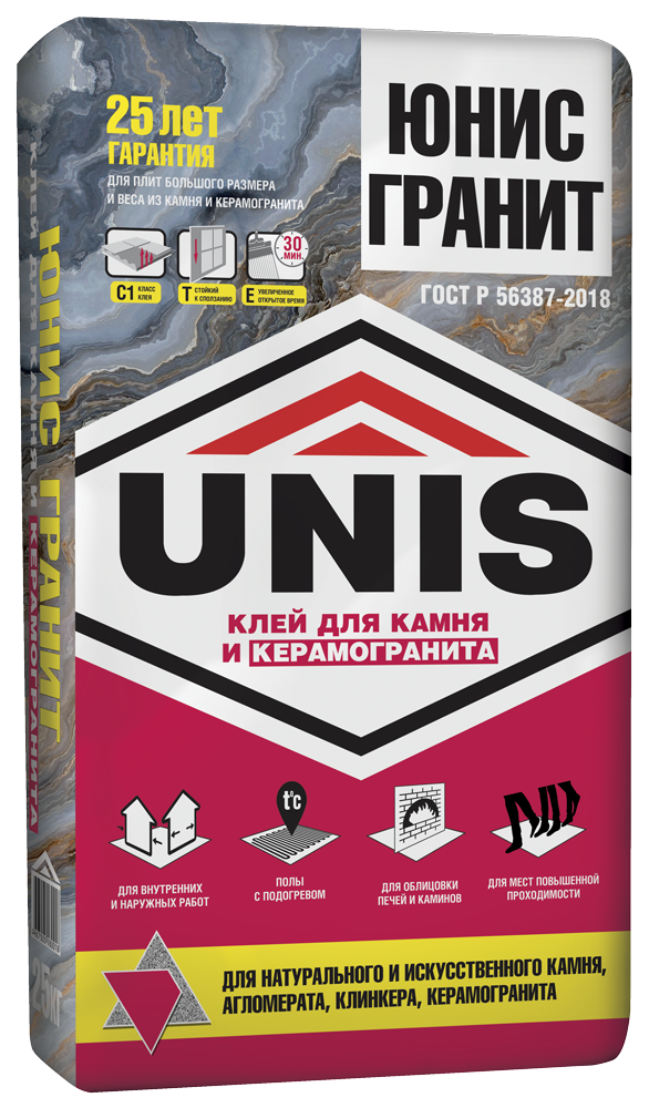 Клей плиточный Unis Гранит (25кг) предназначен для крепления крупноформатных плит из природного камня и керамогранита.