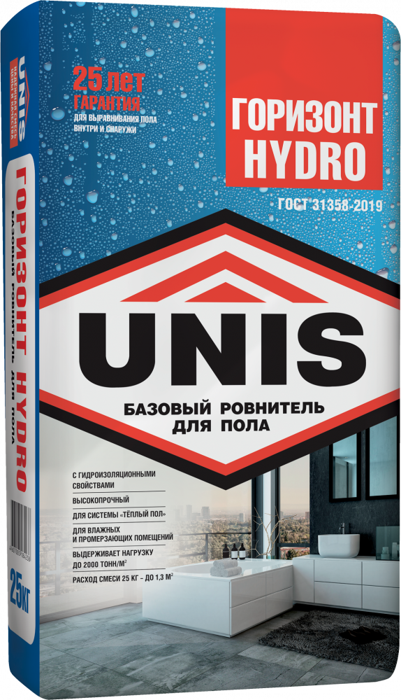 Ровнитель (Стяжка для пола) UNIS Горизонт HYDRO (25кг) предназначен для подготовки прочных, ровных оснований (стяжек) под укладку напольных покрытий, нанесение финишных ровнителей. Рекомендуется использовать для внутренних и наружных работ (лестницы с облицовкой плиткой, крытые веранды, балконы, отмостка), в сухих и влажных, промерзающих и отапливаемых помещениях.