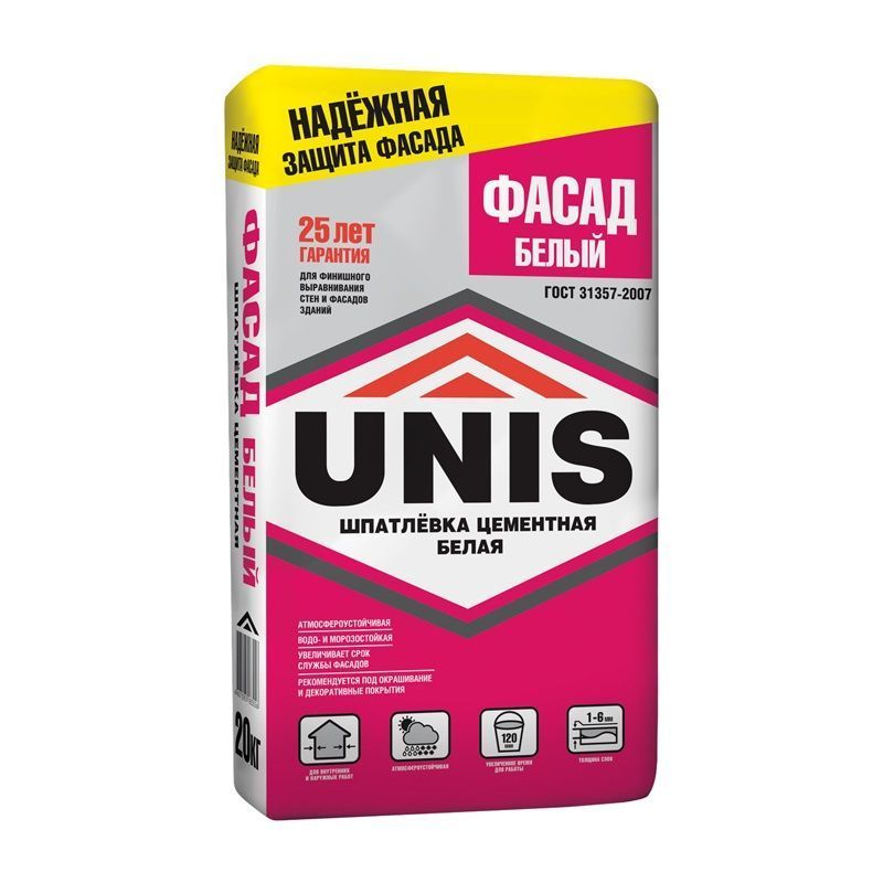 ЮНИС Шпаклевка цементная Фасад белый (25кг) предназначена для финишного выравнивания поверхностей фасадов зданий, заделки выбоин, трещин, раковин слоем до 6 мм под последующую отделку декоративными покрытиями. Рекомендуется для высококачественного окрашивания.