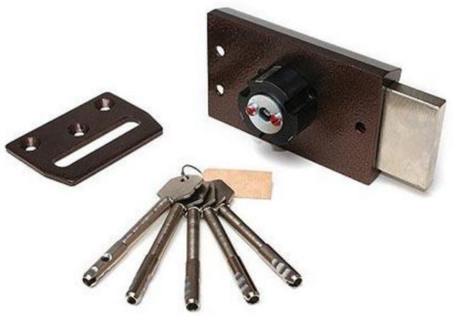 Замок накладной Барьер 2P, с круглым ключом и прямоугольным ригелем предназначен для установки во входные деревянные и металлические двери.