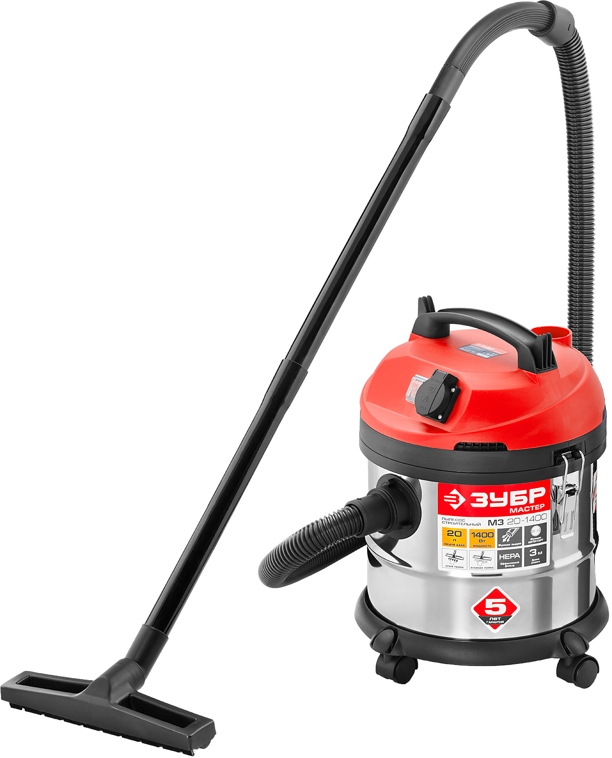 Строительный пылесос ЗУБР МАСТЕР М3-20 ПУ-20-1400 М3 используется для уборки производственных помещений и строительных площадок. Мощный двигатель 1400 Вт обеспечивает отличную производительность и большую силу всасывания. Благодаря наличию встроенной розетки к пылесосу можно подключать электроинструмент мощностью 100-2000 Вт. Корпус бака сделан из нержавеющей стали, что гарантирует долгий срок службы и устойчивость к коррозии.